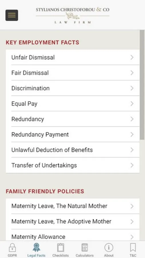 The application aims to inform and provide managers with an easy-to-use, mobile database of all matters regarding Cyprus Employment Law and the application of the General Data Protection Regulation (GDPR). The Stylianos N. Christoforou & Co. LLC team hopes to simplify your everyday work life with information at your fingertips, and without the bureaucratic burden of searching for it. Whether you are a General Manager, a Human Resources Manager, a Managing Director, or a Data Protection Officer (DPO) all the information about the general principles of Employment Law in Cyprus and GDPR is now instantly accessible for review and search by downloading "The Cyprus Employment Law and GDPR Tool".