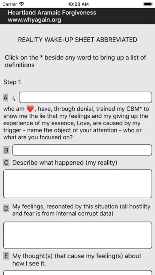 The premise is that our essential nature, our very BEING, is Love. The goal of this internal Aramaic Forgiveness Wake-Up Sheet process is to empower one to remove what is less than Love and return one to the direct experience of Love. True forgiveness is NOT pardoning the other person but it is going inside and removing what does not belong in us.Actuality is what is truly happening in the world that the Creator created. Reality is one’s perceptual construct of what is happening. Reality is a unique picture in one’s own mind, the world they see based on what energy is moving in them, based on goals they hold.This App consists of two versions of our Aramaic Forgiveness Wake-up Sheet process.They each go step by step to identify the thoughts, feelings and the goal one holds in each situation. It is the how to that guides one to cancel the goal, return to Love, to change their mind and thus change their life.