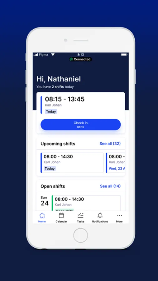 With SameSystem Check-in, you register attendance with a single push in the app, both when arriving, departing, or going for a break.
