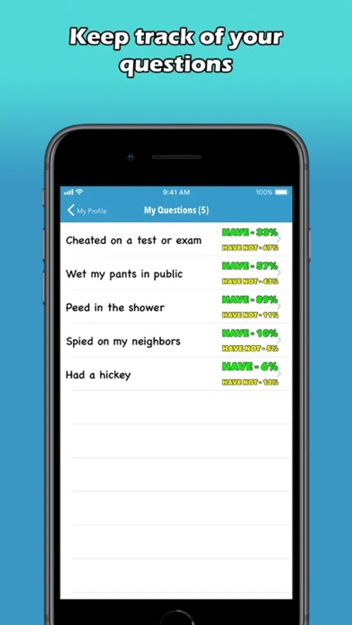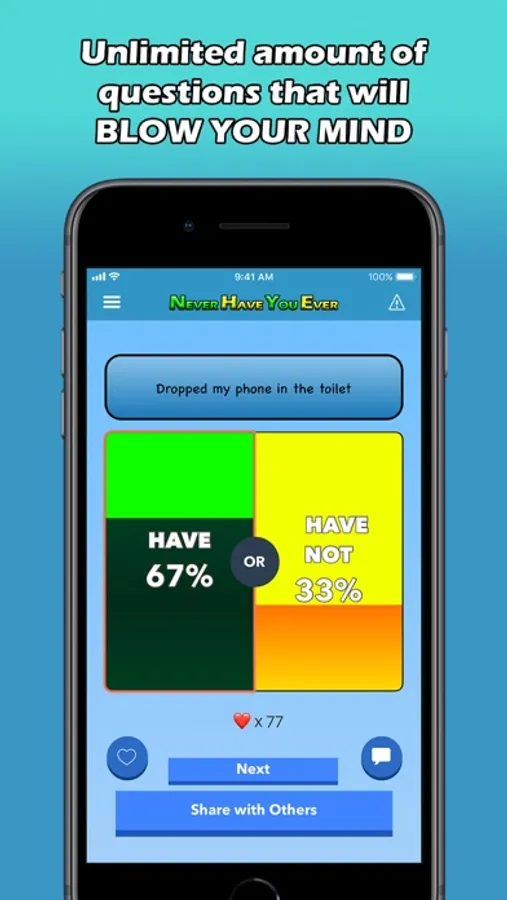 Welcome to the first Never Have You Ever Social Network on iOS! From the creators of the first and biggest Would You Rather network on iOS. Share your past experiences and see what other people came across by answering witty Never Have You Ever questions that will turn heads around. Submit your own questions and see how the community responds. Answer and compose the most questions to become #1 in the leaderboards! The Never app has a huge amount of questions, and more questions are added every day. Have a good laugh with this application and join the Never Have You Ever community!