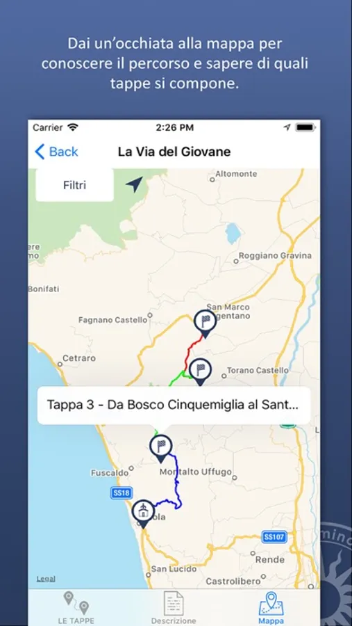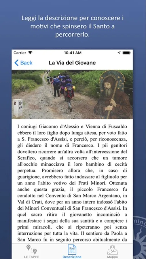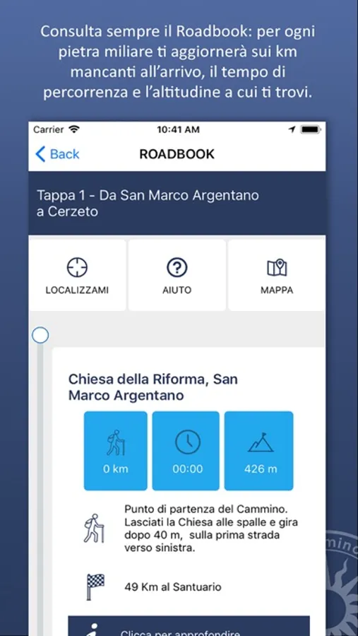 Tieni l’app sempre a portata di mano: ti aiuterà a percorrere il Cammino di San Francesco di Paola, rivelandoti in ogni momento dove sei e cosa c’è di interessante vicino a te. Ti darà indicazioni sulla strada da prendere, sulla presenza di aree di sosta e di acqua potabile. Ti terrà sempre aggiornato sulla distanza percorsa e quella ancora da percorrere, il tempo che impiegherai e l’altitudine a cui ti trovi. Ad ogni pietra miliare ti racconterà un episodio della vita del santo, raffigurato sulle maioliche dipinte.