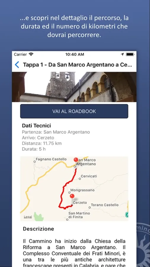 Per ogni tappa del cammino avrai a disposizione: - Il ROADBOOK, il tuo diario di viaggio, con l’elenco di tutte le pietre miliari disposte lungo il percorso, la distanza in km dal santuario, il tempo di percorrenza e l’altitudine. Nell’approfondimento troverai il racconto legato alla maiolica presente sulla pietra.