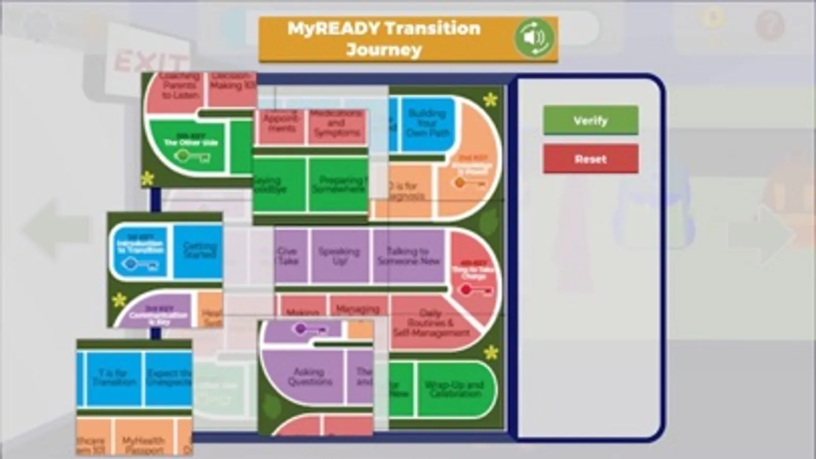 It's gaming approach in the form of a Journey in the City with a mentor (virtual coach) that helps the user to navigate the buildings, sequentially introduces the educational sections designed to enhance education and medical information management as well as social skills to enable self-management in preparation for adult health care systems. The content of the App is composed of messages, texts, quizzes, videos, as well as skill-based-achievement challenges.
