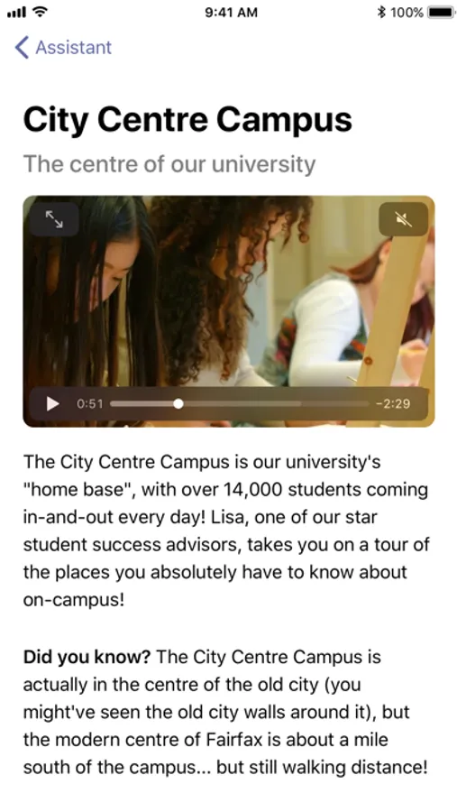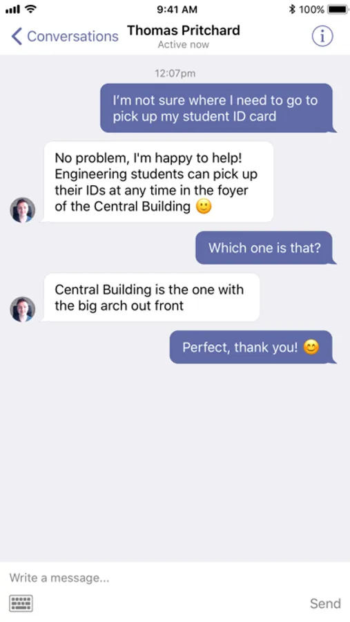 • Sometimes you need to talk to someone to solve an issue or get some info. With a quick tap of the "conversations" icon, you can be connected instantly to a trained member of staff at your university, ready to solve your problem in real-time. No more awkward emails sent out into the ether.