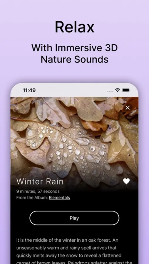 • Calm yourself with the all-encompassing voices of thunderstorms, rain, wind and waves.