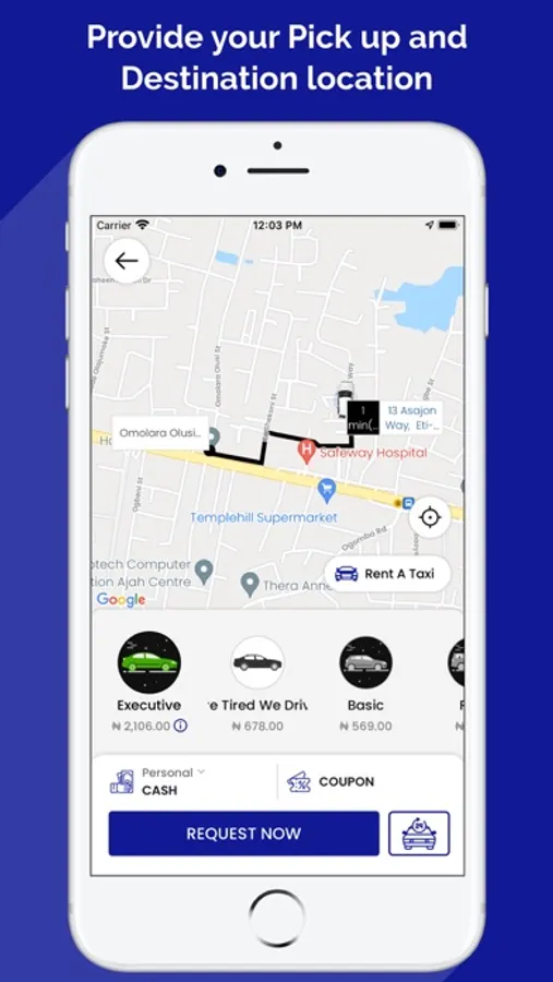 To request for services, the customer is required to indicate pick-up location and destination in the appropriate fields. Then customer chooses service type/option, preferred mode of payment, and pick-up time(if not immediate). Thereafter, driver arrives and trip/delivery/etc. is conducted. On completion of a trip, user/customer makes payment through any of the following channels: