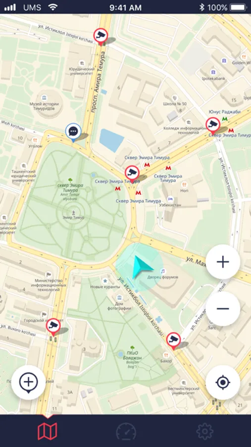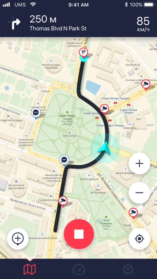 Приложение Kamera Bor - показывает камеры видеофиксации по ходу движения автомобиля, указывает тип камеры, расстояние до камеры, вашу скорость и ограничение.