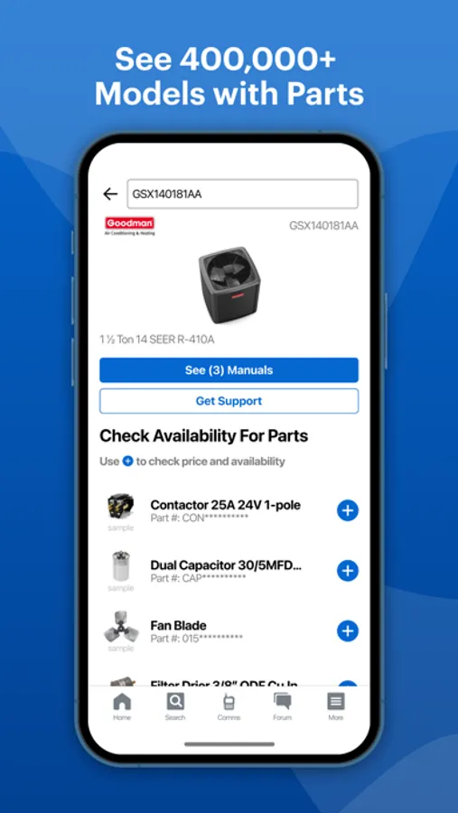 - Database of 500,000+ HVAC units (manuals, part lists, controls, support FAQ)