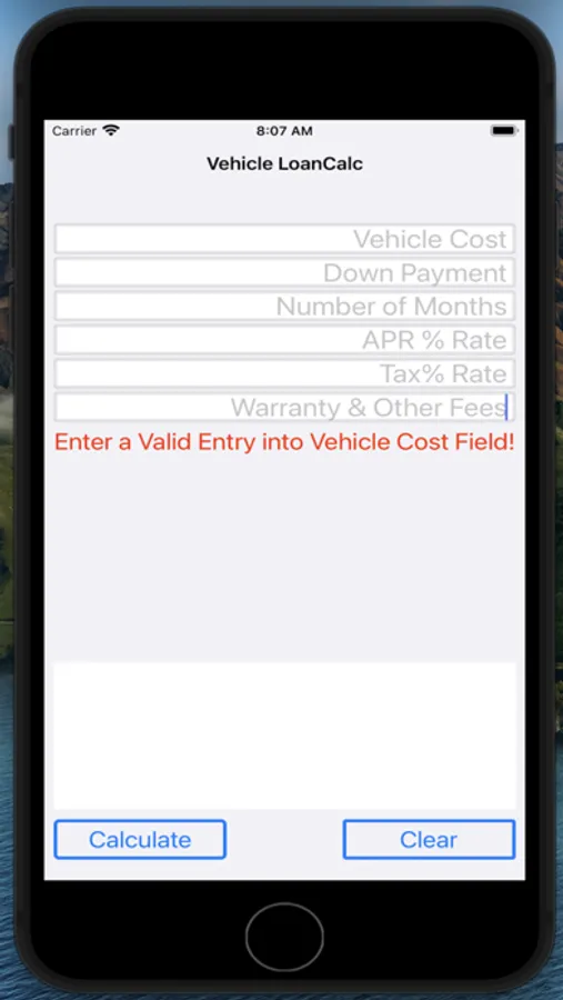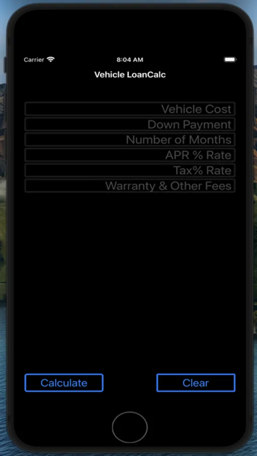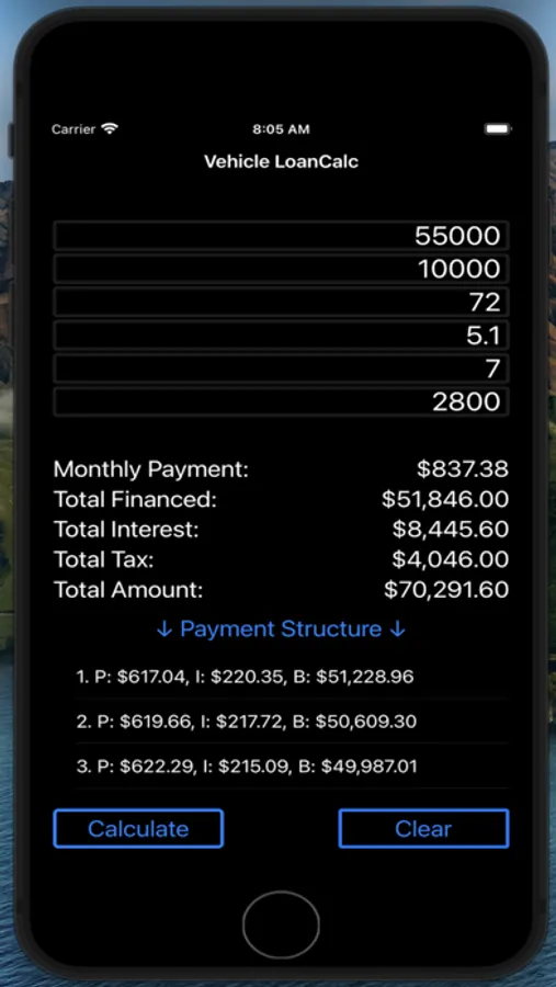 This is a loan calculator for a vehicle. Just enter the cost of the vehicle, the amount of the down payment, the term of the loan, the APR%, the tax%, and the warranty & other fees and then click the calculate button and the loan calculator will return the monthly payment, the total financed, the total interest, the total tax, and the total amount paid for the vehicle. It also calculates a loan structure of each months payment.