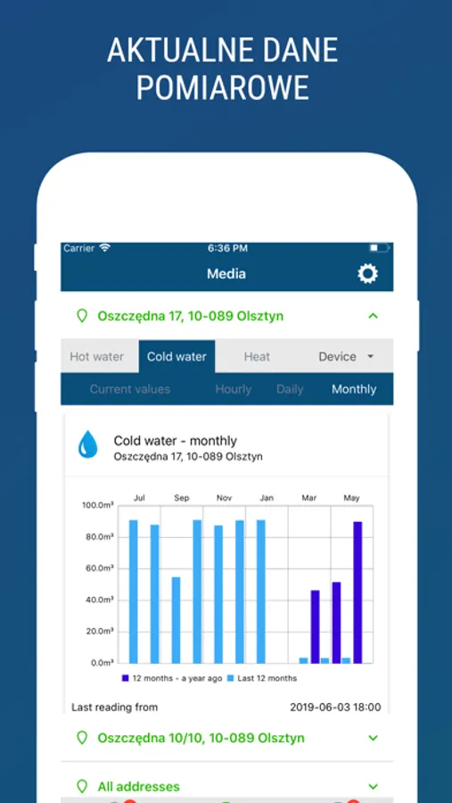 MEDIA - w aplikacji na bieżąco udostępniane są odczyty z urządzeń pomiarowych, np. wodomierzy, ciepłomierzy czy podzielników ciepła. Dane przedstawione w postaci graficznych wykresów, dają bardzo przejrzysty podgląd zużycia ciepła i wody oraz umożliwiają porównywanie zużycia w czasie.