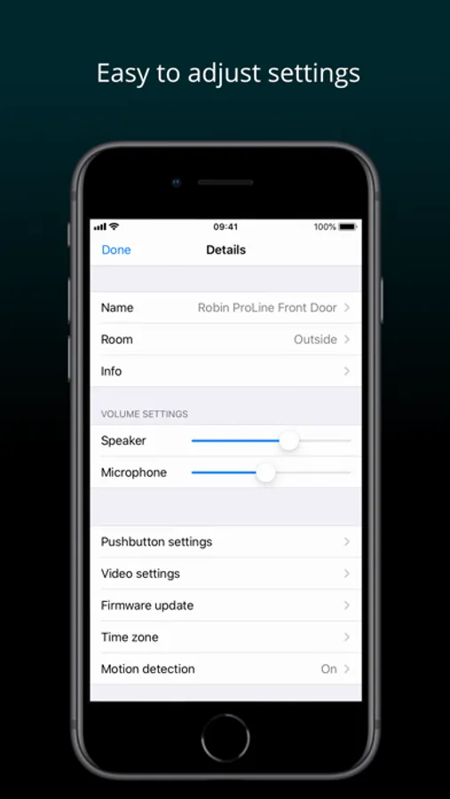 With the free Robin App you can easily adjust the speaker- and microphone volume settings, adjust sensitivity of the push button, show the historical snapshots stored on the local SD, configure the motion detection and perform future software updates.