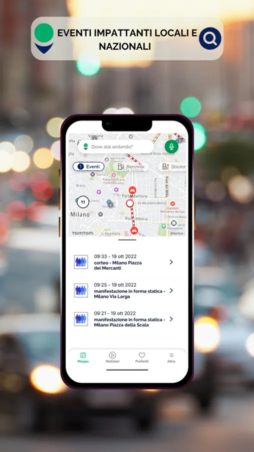 Rimani costantemente aggiornato sulla mobilità della tua città con avvisi sul traffico, polizia, pericoli lungo il percorso da te scelto.