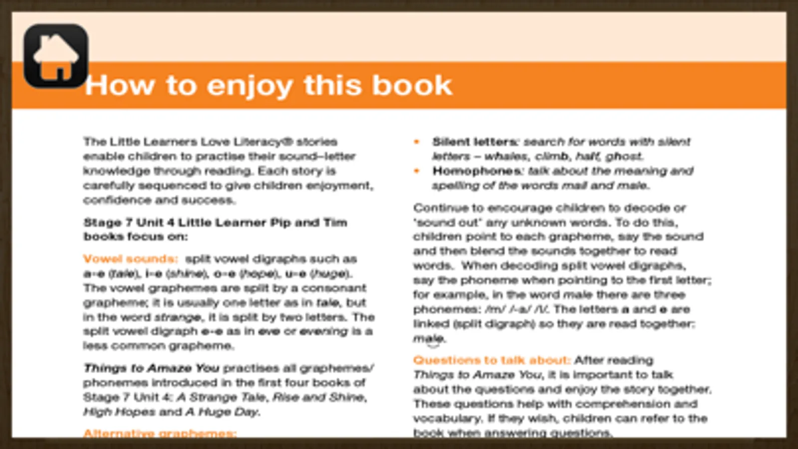 Little Learners Love Literacy is a sequenced phonics reading program designed to give children success and confidence. The Stage 7 Unit 4 Tim and Pip chapter books focus on split digraphs such as a-e (tale), I-e (shine), o-e (hope), u-e (huge). A Strange Tale also introduces the change in sound when c and g are followed by an e, i and y , for example, in cage, nice etc. Homophones are practised in a game at the end of A Strange Tale. In the story Rise and Shine events are shown in a story mapping format, introducing children to another genre. The teaching notes are detailed giving lots of information about how to introduce new phonemes and graphemes. These engaging stories provide reading practice for children who are mastering split digraphs.