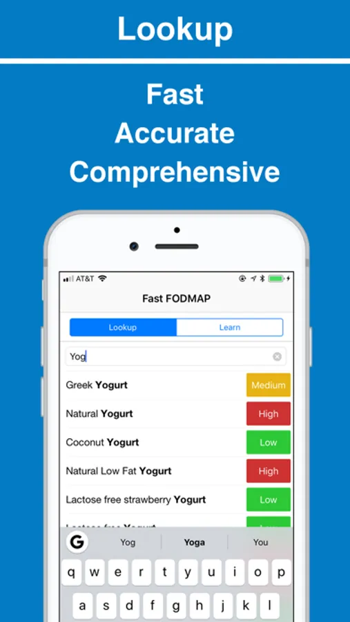 The lookup function focuses on just SPEED and ACCURACY. The two things that matter most when you are trying to follow a low FODMAP lifestyle. As soon as the app launches you can start typing and see the results as you type (an idiom called incremental searching). Looking up a food item should not be a pain, it should be FAST and EFFORTLESS.