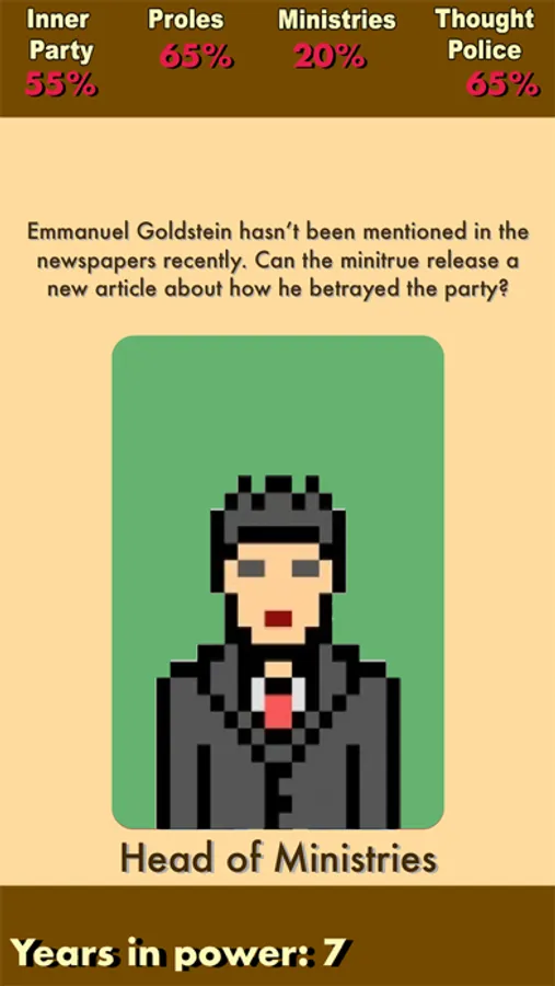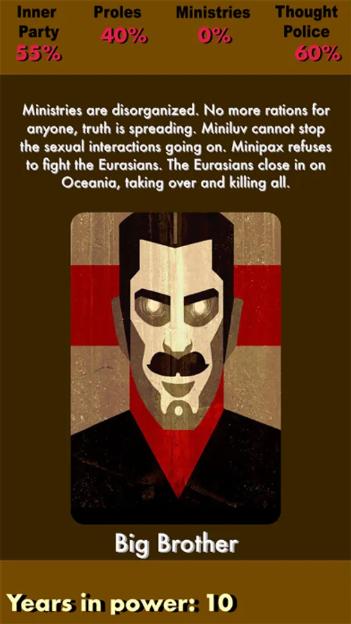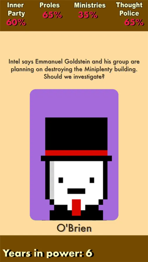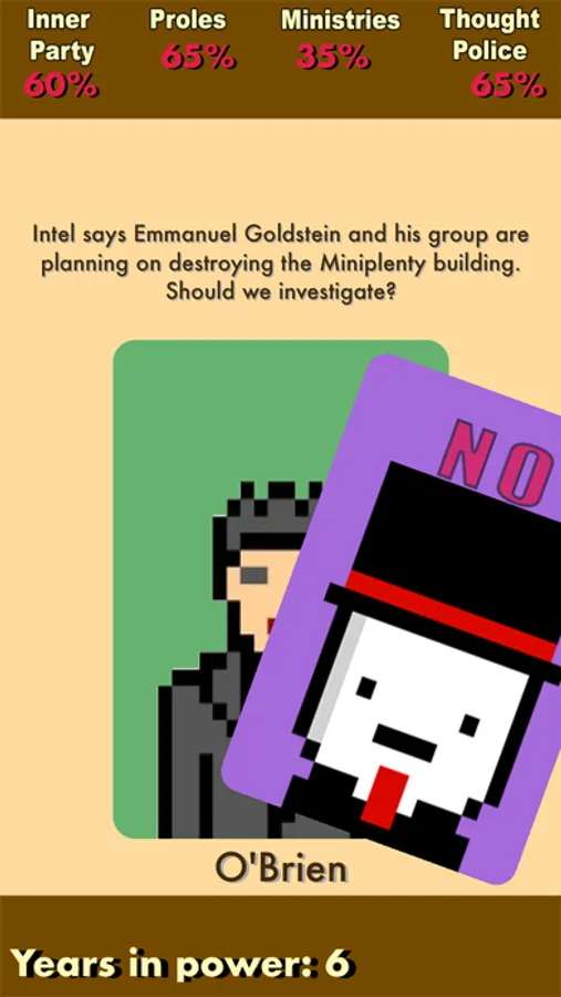 Rule over Oceania by swiping either left or right to impose your will upon the country. Survive while maintaining balance between the four factions. But beware; each decision you make has consequences.