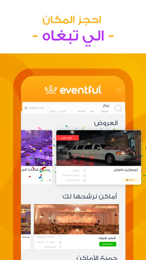 في ايفينتفل، صممنا لكم أعظم تجربة مستخدم تسهل لكم عملية تجهيز المناسبة ابتداءً من المكان (من قصور وقاعات وغيرها)، ونمكنكم من حجزها مع أهم الخدمات الخاصة بمناسبتك، بشكل فوري، بدون تفاوض، بكل شفافية، بضغطة زر عن طريق تطبيق ايفينتفل.