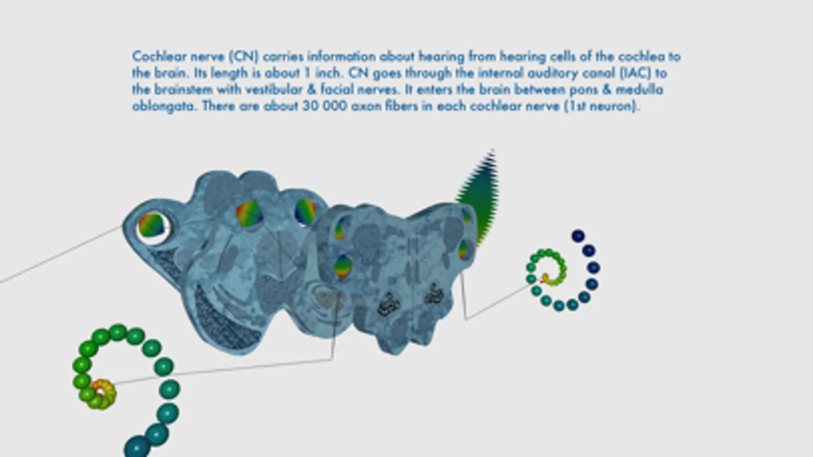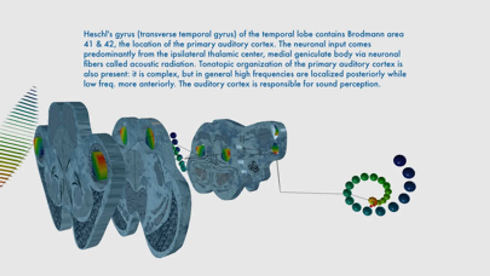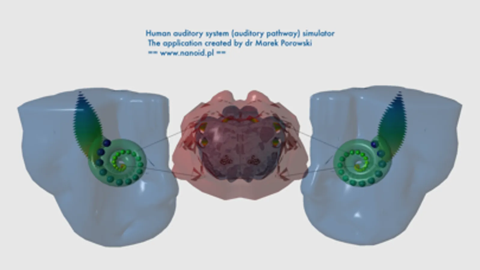 The purpose of the app was to show the scheme of the auditory pathway, its tonotopic organization, and function. The app shows anatomical structures of the brain involved in the processing of hearing information. It shows classic ascending pathway from the cochlea to the superior temporal gyrus where the primary auditory cortex is located. Every structure visualized in the application has a short description with most important information about it.