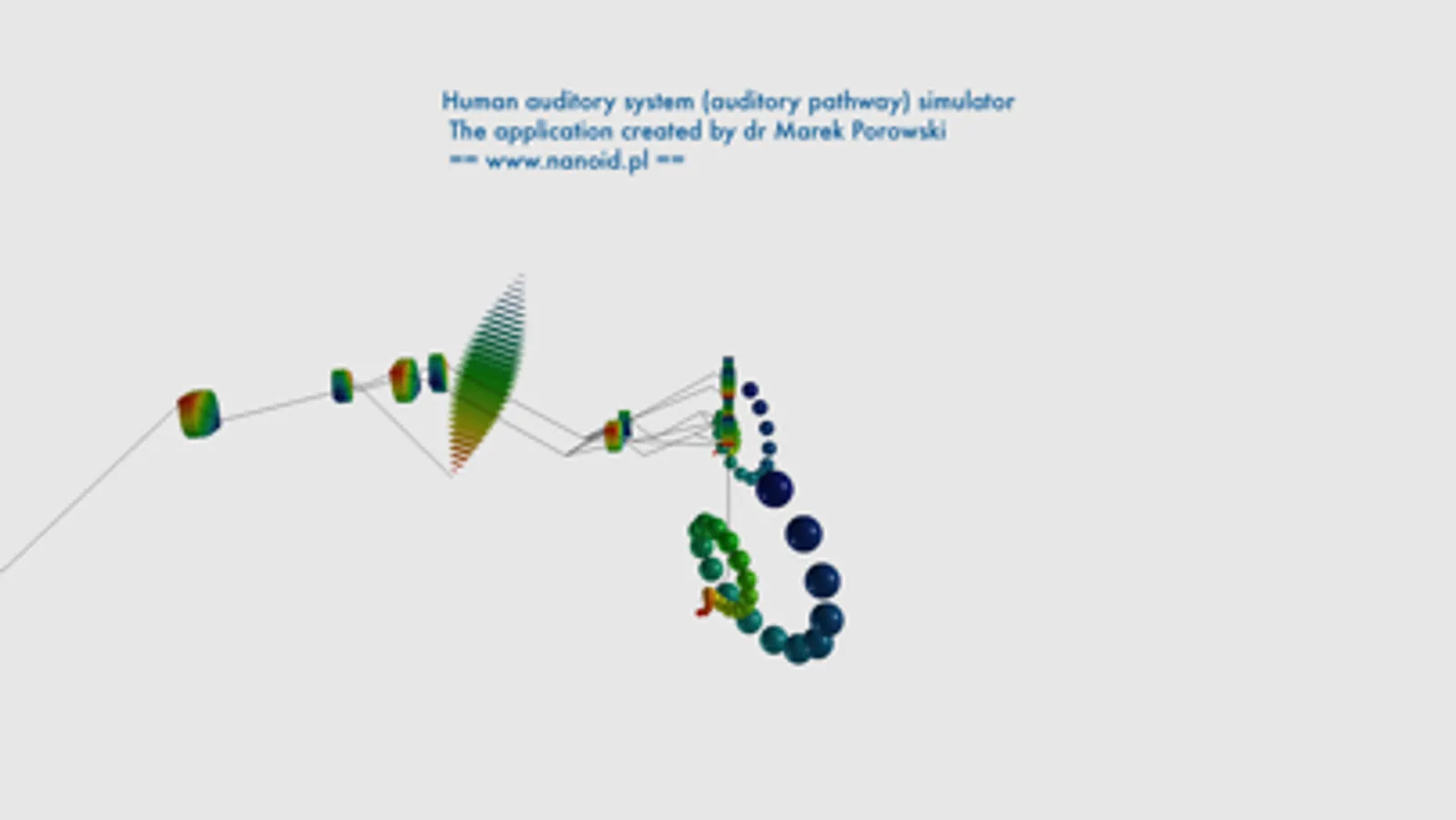 What is really interesting about the app, you can visualize the flow of the information in real time: the input from the microphone is divided into several frequency ranges. Then the amplitude of given range is mapped to the region of the cochlea that is responsible for the process of converting energy: you can observe high frequencies in the basal turn of the cochlea as the blue dots, mid frequencies as the green dots and low frequencies in apical turn as the red dots. The signal from the cochlea is then directed to the deeper brain structures and finally reach auditory cortex of the temporal lobe.