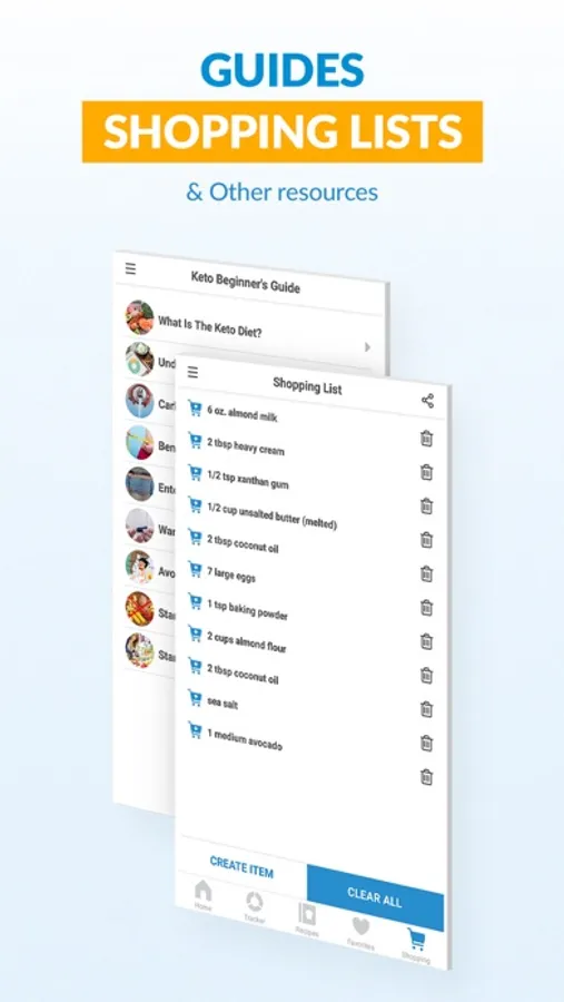 • Shopping List – add ingredients from keto recipes or your own ingredients.