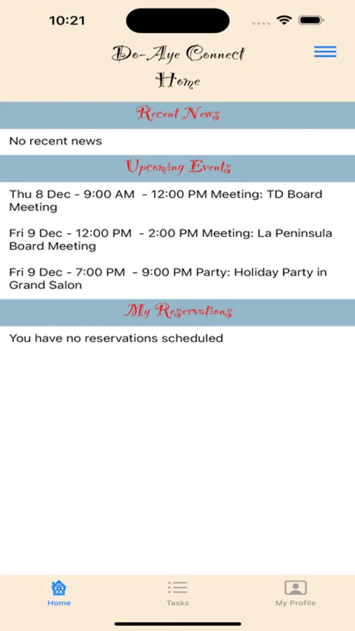 Do-Aye Connect provides condo and community associations a way to connect their owners/members. Users can create and view upcoming events, enter maintenance requests, reserve amenities, view documents related to the association, and see a directory of association members.