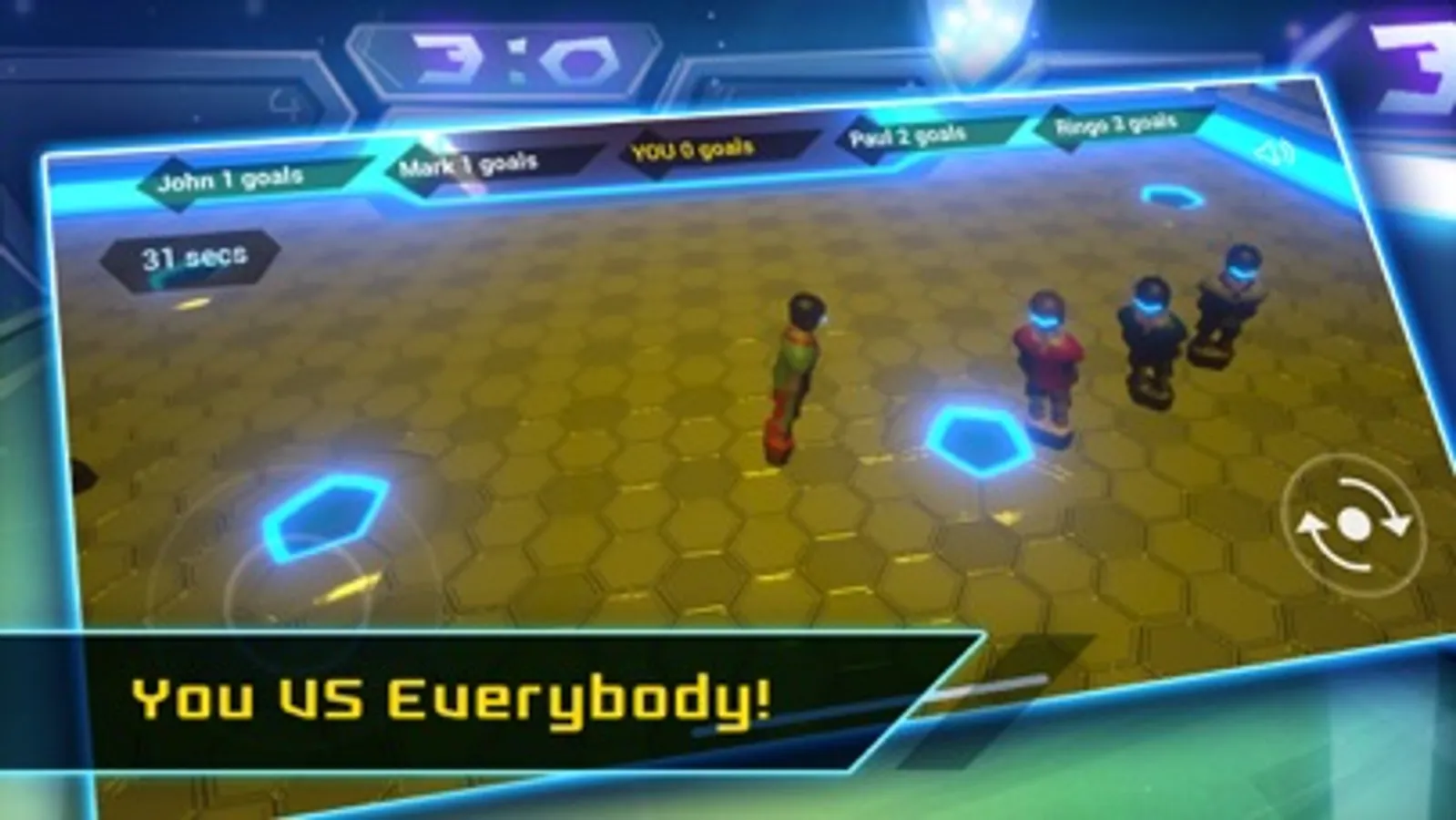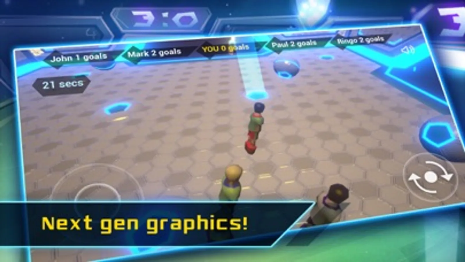 The idea is simple: you are playing against every other player, and you can score in any of the multiple gates in the futuristic field. The position, angle and speed of the ball when spinning allows you to control the ball in very different ways, and the enemies will make it difficult to success. Each match last 60 seconds, and the gameplay is fast and rewarding, allowing intense competition.