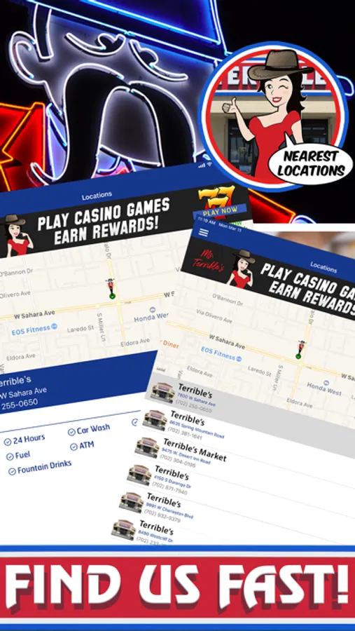 First, you get everything Terrible's! Find your nearest location and its amenities with the intuitive store map locator. Discover and enter Terrible’s current deals & promotions. And, through the My Status page, instantly check your status on Terrible's Social House loyalty programs including the new in-store purchase rebate and better-than-ever drink club.