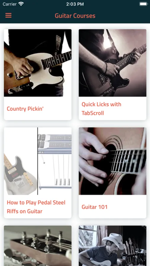 Add songs you want to learn to your favorites lists, and move them to your conquered list when you've mastered it. Six String Country offers 8 full length guitar courses and master classes. Guitar 101 is designed to be a resource from the day you bring home your first guitar. From there, choose from courses in beginning improvisation and soloing, a country pickin' guitar course, a guitar theory workshop, an acoustic fingerstyle course, or master classes in Chet Atkins style, Jerry Reed's style, or the Total Electric Blues Guitar Master Class.