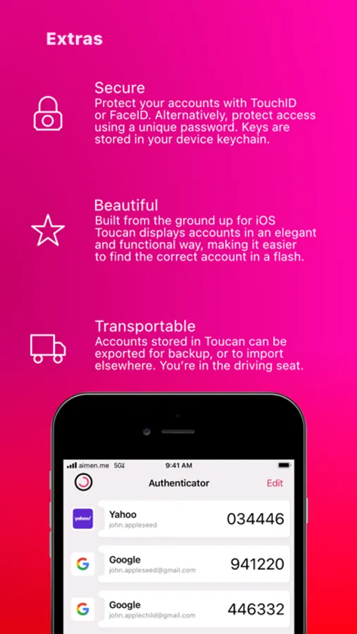 Toucan is the best two-factor authentication app, built specifically for iOS. With Toucan Authenticator, it’s both easy and enjoyable to stay safe online.