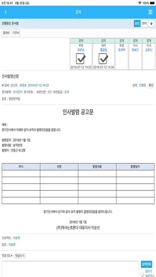 - [결재]는 회사의 정형화된 업무를 처리하고, 의사결정을 할 수 있다. 결재와 협조, 참조와 수신으로 구분되어 회사 내 결재선의 승인프로세스를 충분히 담고 있다.
