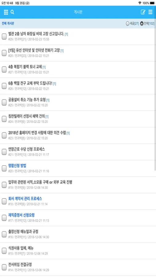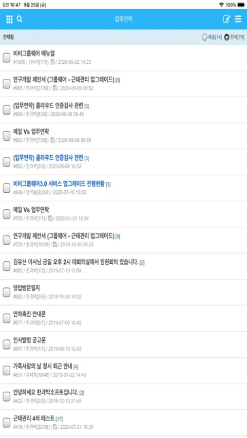 - [게시판]은 회사의 각종 자료를 보관하고 공유하는 공간으로 활용되며, 임직원간 자유로운 소통공간으로도 사용된다.