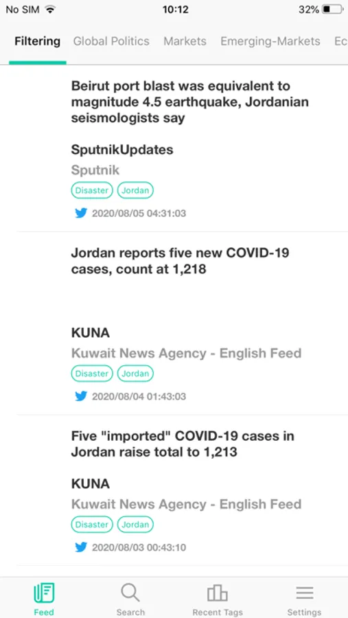 QUICK Global Alert is a filtering service that monitors the Tweet issued by the correspondent's Twitter official account and the government official's Twitter official account and redistributes the Tweet related to the geopolitical risk as soon as it finds it.
