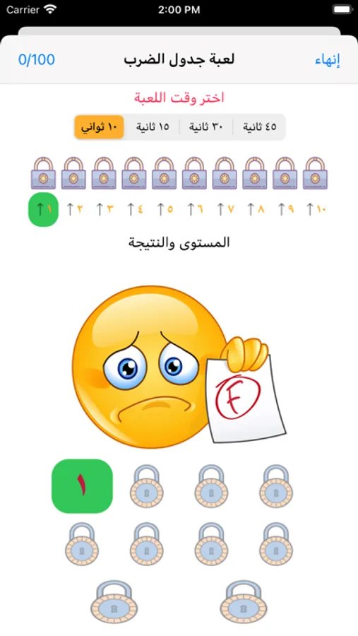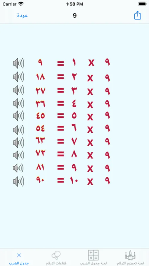 لعبة جدول الضرب ، ستتعلم جدول الضرب من خلال التمرن على عشرة مستويات من الرقم ١ الى ١٠. تستطيع تغيير الوقت للوصول الى اسرع وافضل نتيجة.