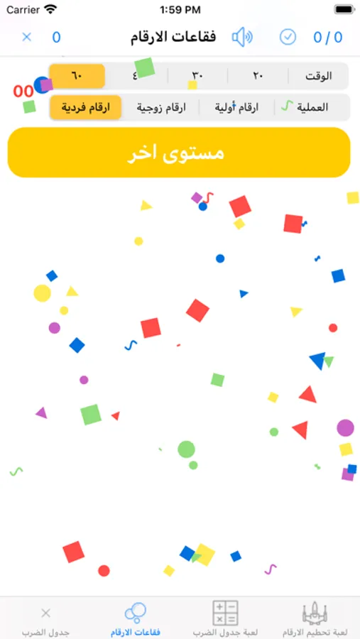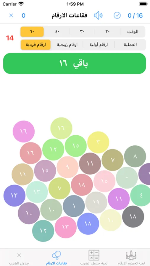 لعبة الفقاعات، في هذة اللعبة سوف تتدرب على ا ختيار الارقام الفردية والزوجية والاولية. الارقام الفردية هي التي لاتقبل القسمة على اثنين بدون باقي مثل 1,3. الارقام الزوجية هي التي تقبل القسمة على اثنين بدون باقي مثل 2,4. الارقام الاولية هي التي لاتقبل القسمة الا على نفسها او على الرقم واحد. مثل 7,11. اختر وقت اللعبة ثم نوع العملية وابدا التديب.