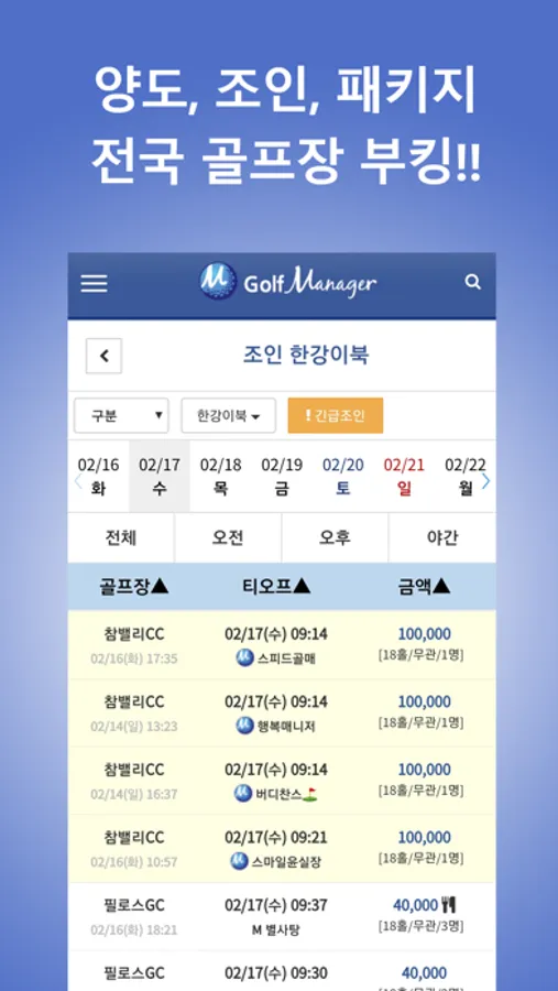 sbs골프, jtbc골프, 골프존, 엑스골프, 에이스골프, 골프몬, 골팡, 이츠골프, 골프락, 골프랜드, 골프콜, 부킹에이드 등과 다른 전문 골프매니저가 고객님께 편리하고 친절하게 예약/조인 정보를 제공합니다.