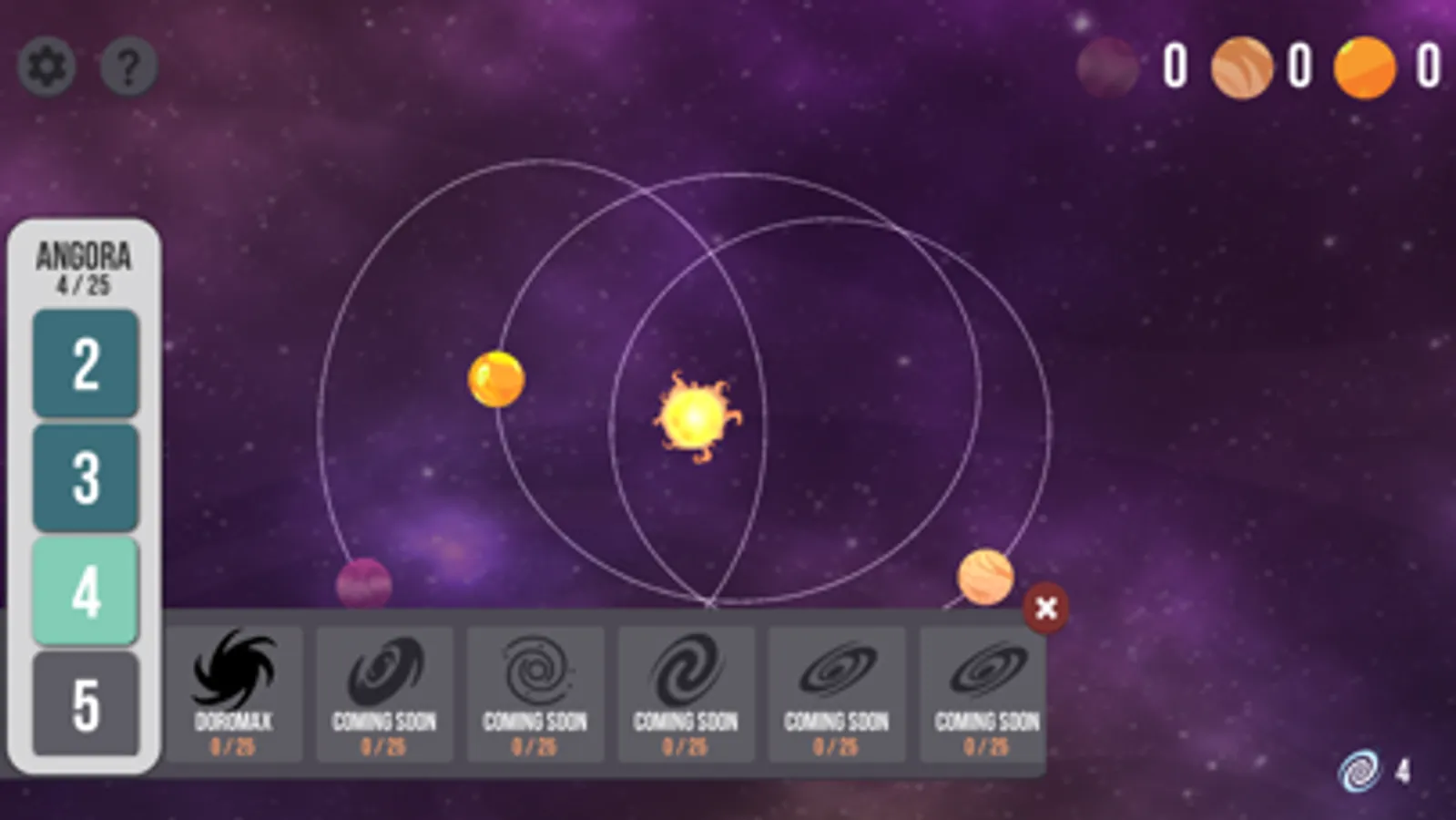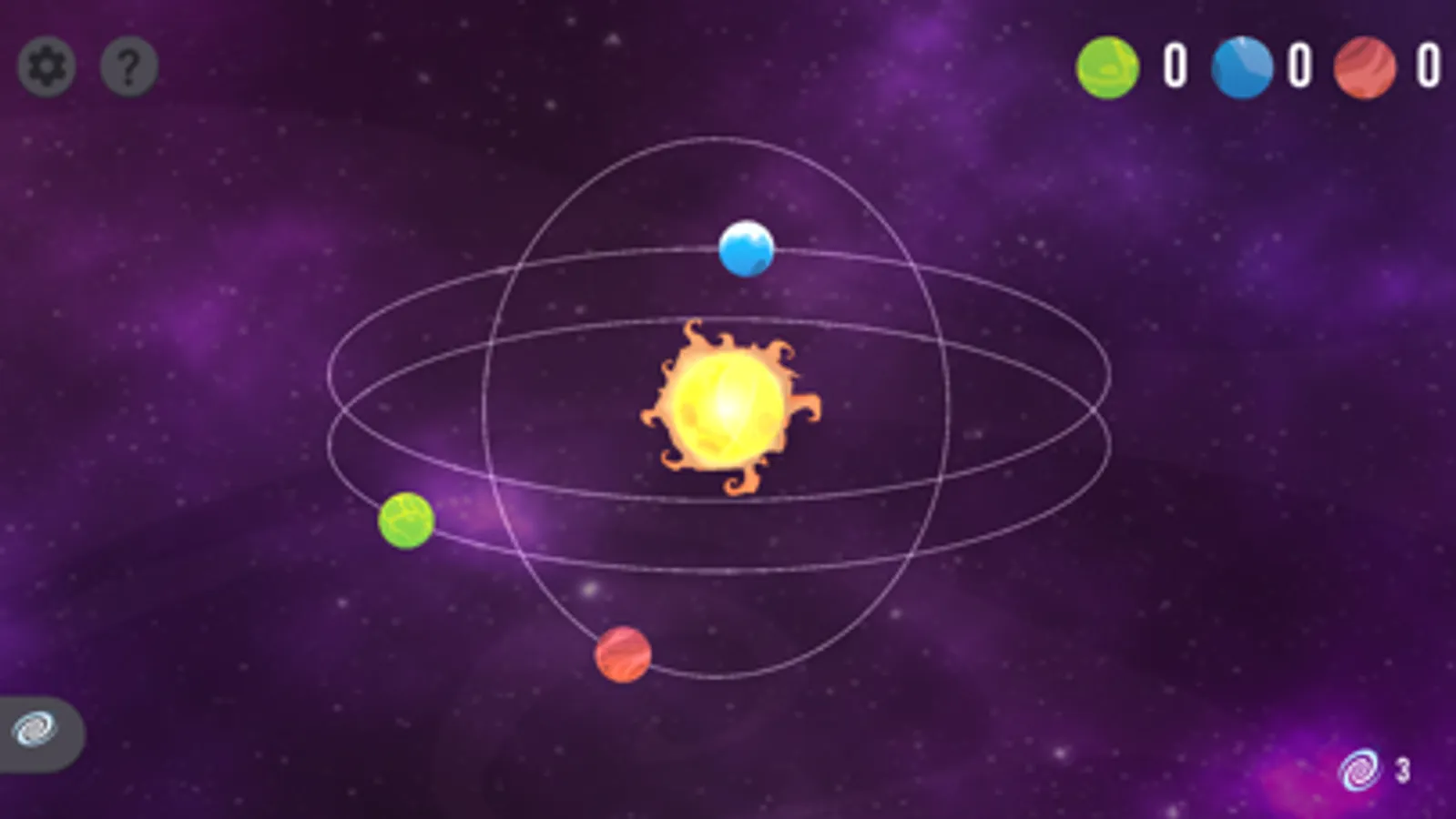 A puzzle game that is outfitted in different universes. The objective of the game is to set planets in motion without colliding with other planets/objects. Each planet has an orbit path, but they are set to different speeds. After completing four revolutions, the level objective is complete. As the levels progress, there are new elements that are introduced to the game.
