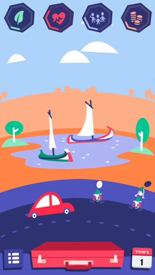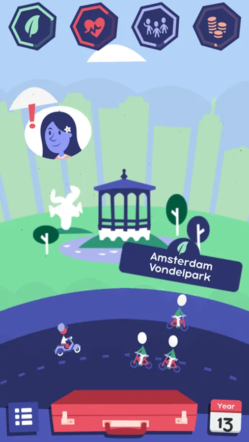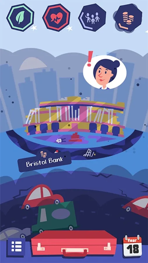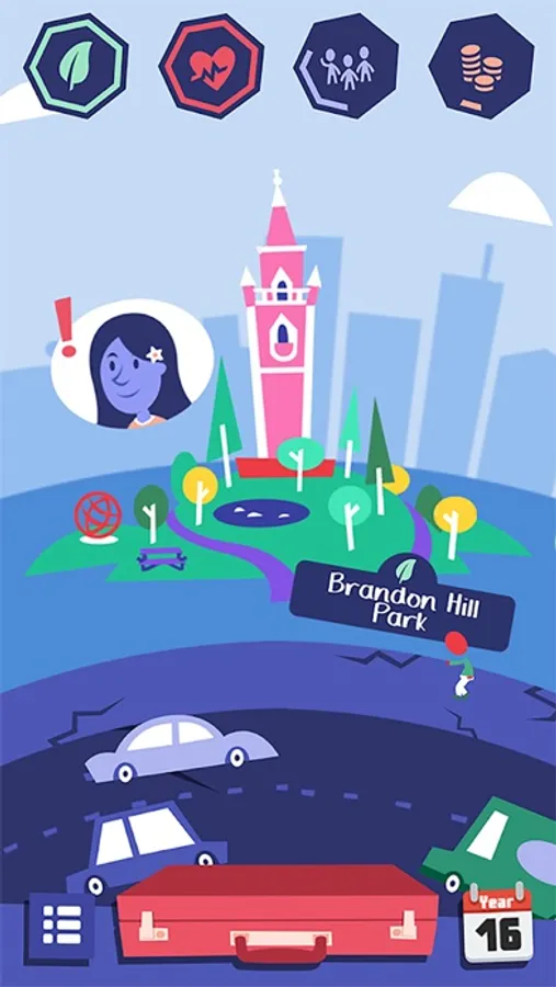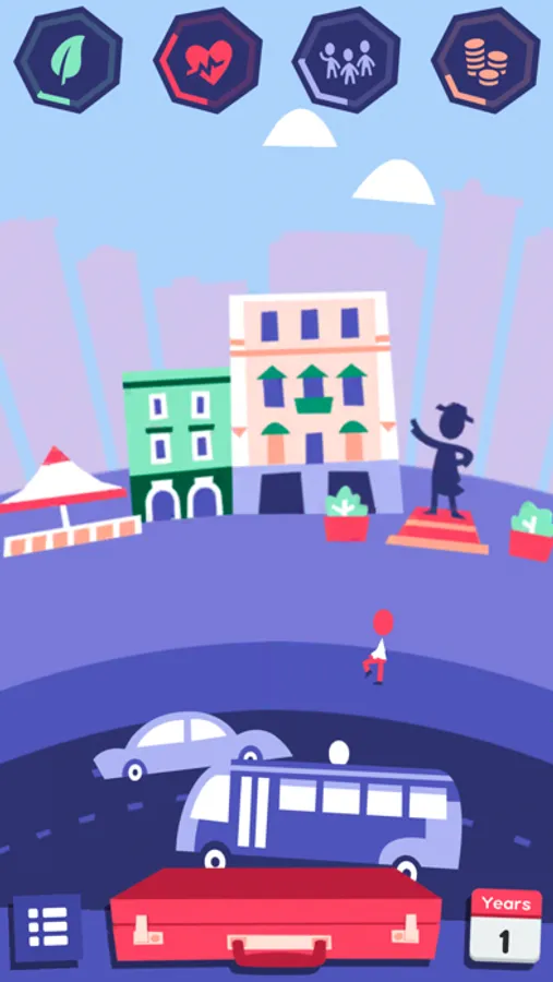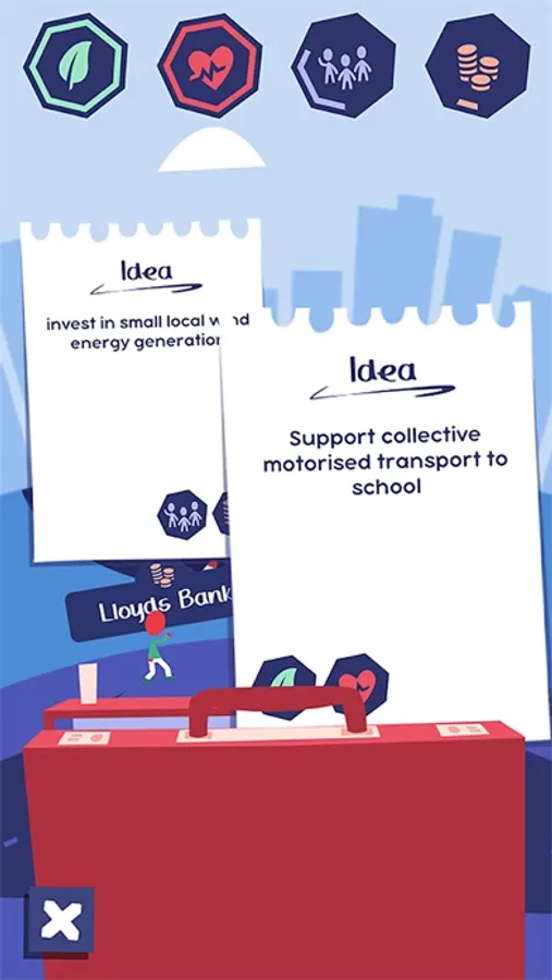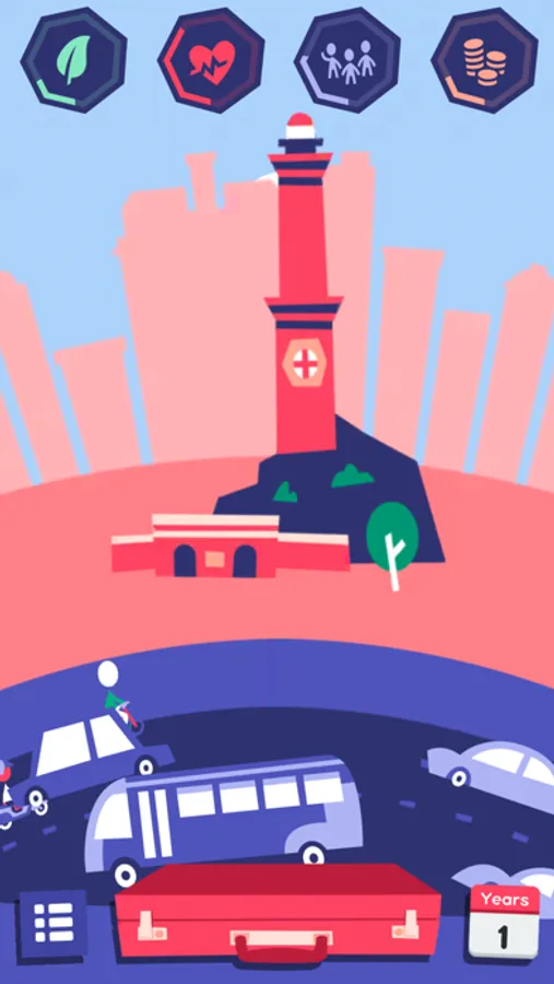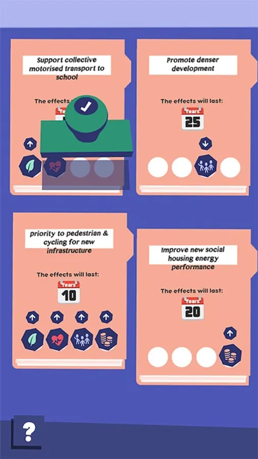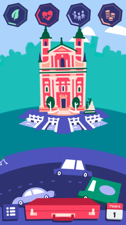 Visit areas representing environment, economy, health, and satisfaction. Collect ideas for city policies that you think sound good, then visit city hall to turn them into law.