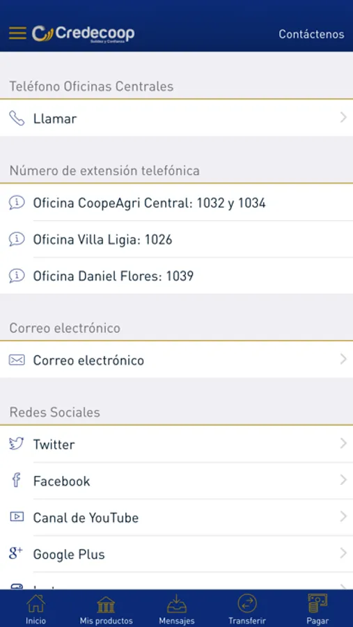 o Acceso a redes sociales, correo electrónico, links de interés y teléfono de la Cooperativa.