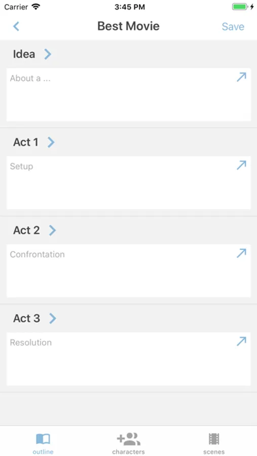 • Structure your story arc with Act 1, Act 2, and Act 3 builders. All three act sections contain Act Beat questions to facilitate new ideas and notes which will prepare you when you're ready to build scenes