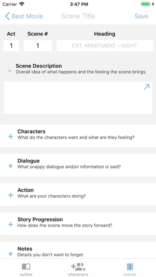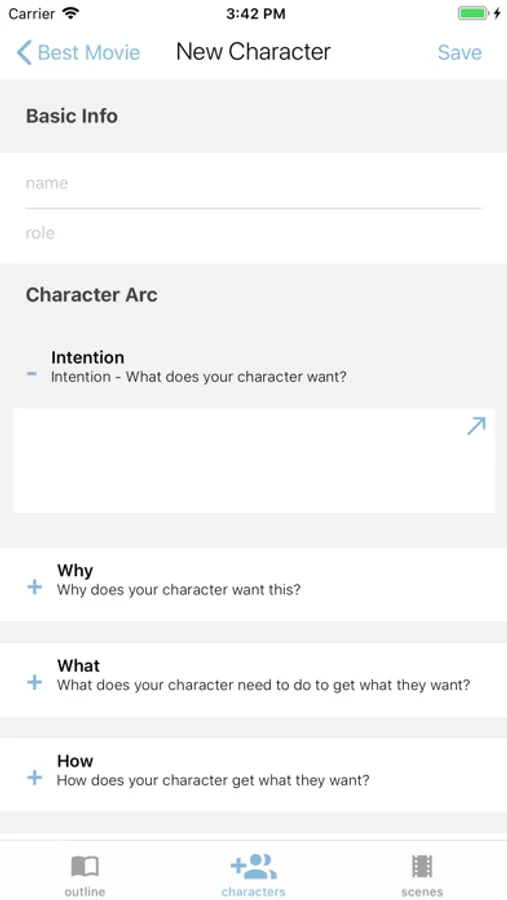 • The "Scene Builder" feature provides useful questions that when answered help bring clarity to what the scene does to move your story and characters forward. (IAP for $0.99)