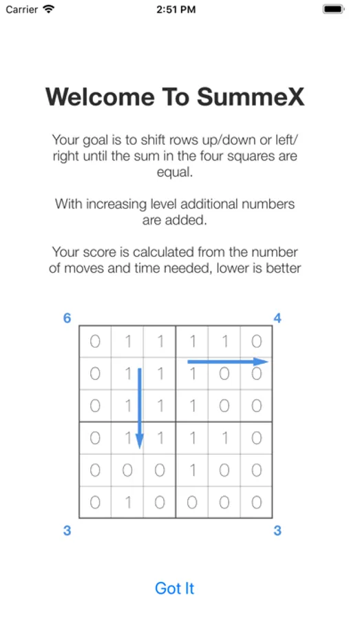 Your goal is to swipe rows up/down or left/right until the sums in the four squares are equal.