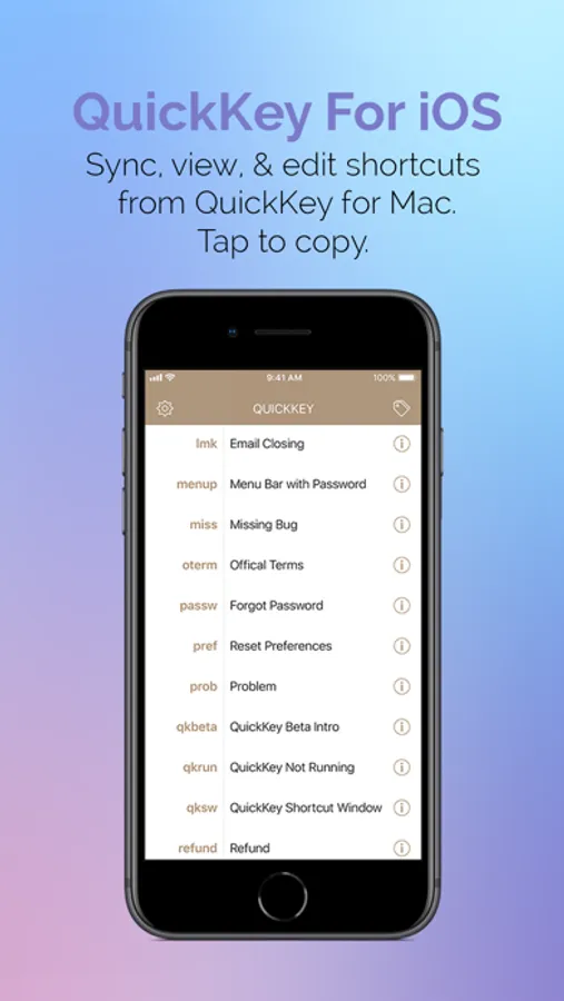QuickKey is a free companion app for the Mac version of QuickKey. The Mac version is required. It allows you to view, edit & copy snippets you created on the Mac version of QuickKey.