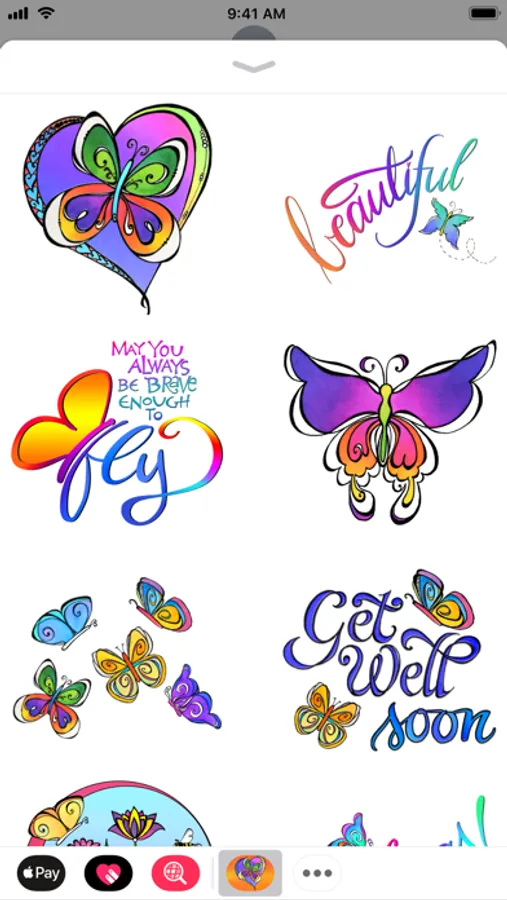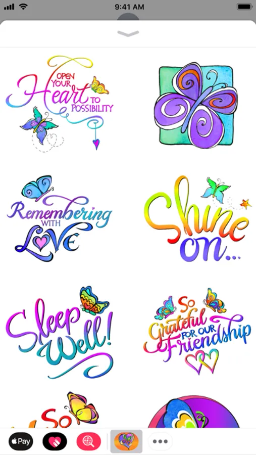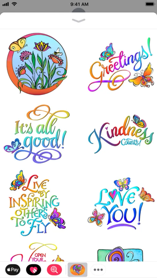 Turn your texts into a virtual hug and help them take flight with the Butterfly Inspirations collection of 25 heartfelt Care-Moji stickers. Designed and hand-lettered by world-renowned calligrapher Joanne Fink of Zenspirations®, these colorful sentiments and illustrations are a great way to brighten someone’s day.