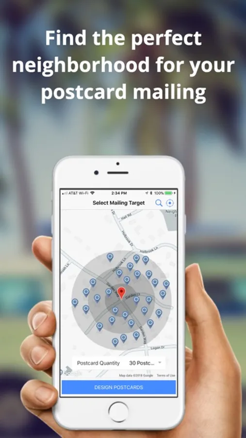With Neighborhood Postcards a small business owner can create and send marketing postcards to any neighborhoods in minutes. Use the app to access our database of 160 million residential addresses. We take care of creating the mailing list, validating addresses, printing and sending postcards.