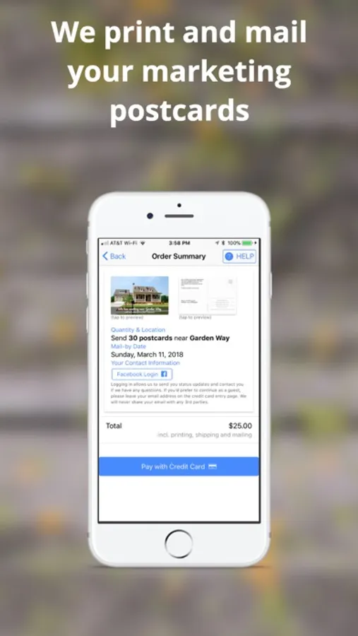 The postcards are printed and mailed to the neighborhood of your choice within 24 hours, arriving at customers' homes 4-6 business days later.