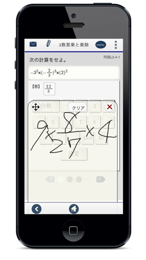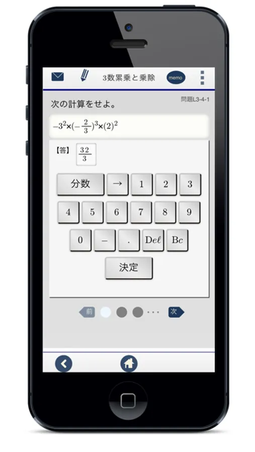解答は選択式ではなく、ソフトウェアキーボードからの入力式で分数も入力できます。