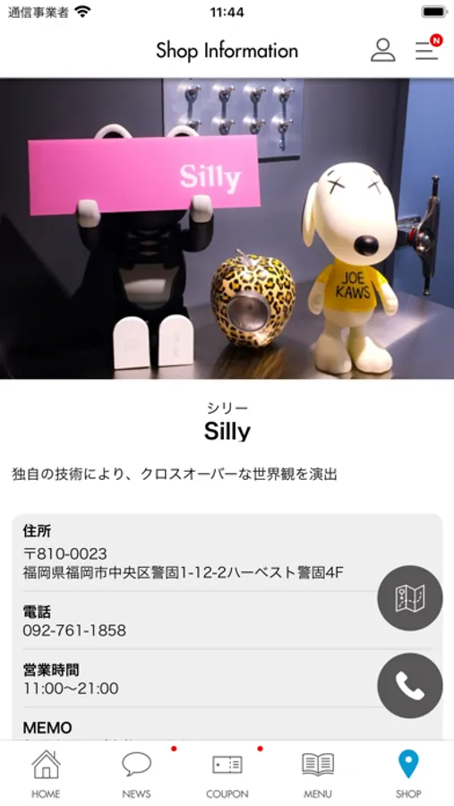 店舗のマップが表示され、地図アプリとも連動しているので、初めてのご来店の時も簡単に見つけることが出来ます。