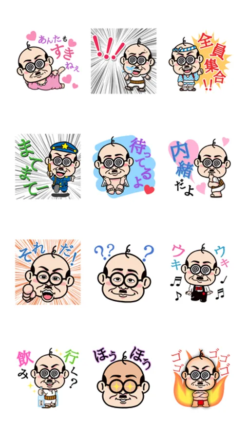 あんたもすきねぇや全員集合!など、ギャグ満載!ちょっとリアルでキモカワな加トちゃんステッカーで楽しもう!