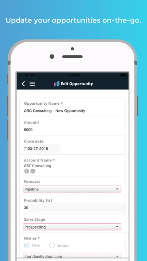 • Access & update Leads, Contact, Account, & Opportunity records from any device and any location