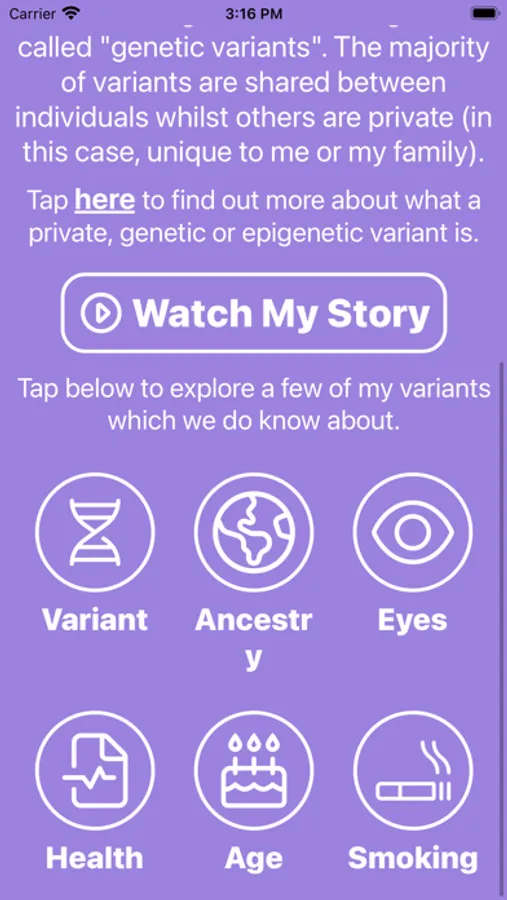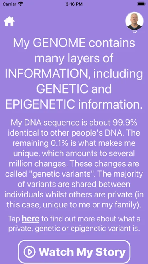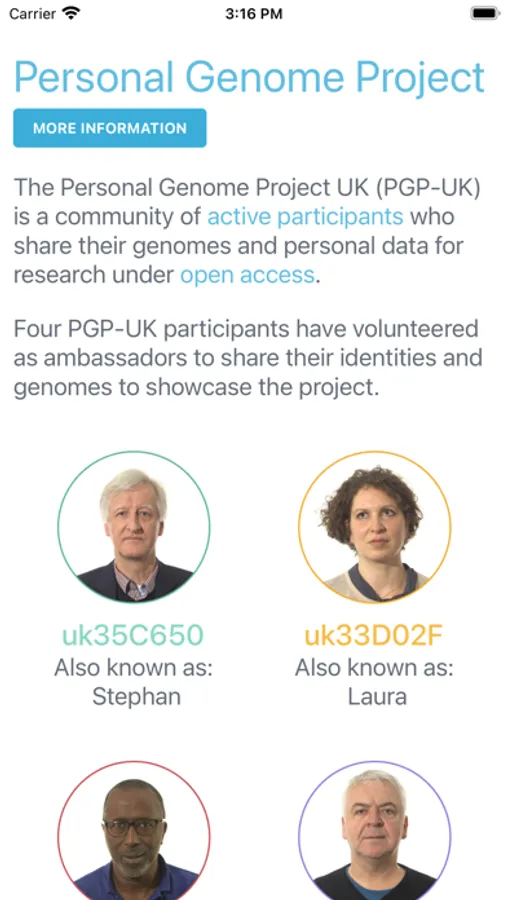 Use the GenoME app to explore the genetic code of four ambassadors for the Personal Genome Project UK, including: