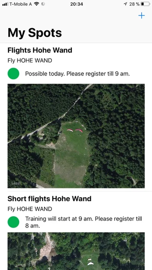 Each My Spot entry shows the name of the spot, the name of the flying school, the current training state and a fly over view of the training spot.